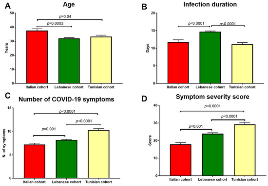 Comparison between the Italian, Lebanese, and Tunisian cohorts with respect to (A) age, (B) infection duration, (C) number of COVID-19 symptoms, and (D) the severity of COVID-19 symptoms. Significant differences were tested by ANOVA with post hoc tests.