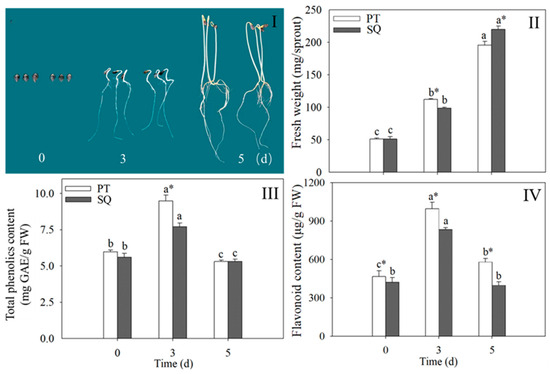Changes in growth morphology (I), fresh weight (II), total phenolic content (III), and flavonoid content (IV) in buckwheat sprouts. Distinct lowercase letters signify statistically significant differences in germination times for the same buckwheat cultivar (p < 0.05). Asterisks (*) denote significant differences among buckwheat cultivars at identical germination times (p < 0.05). PT: Pintian. SQ: Suqiao.