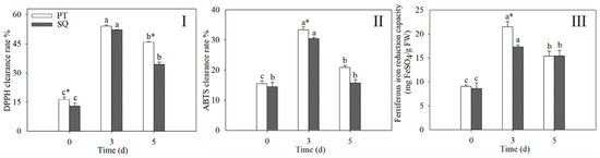 Changes in the capacities of DPPH (I), ABTS (II), and FRAP (III) in buckwheat sprouts are shown. Distinct lowercase letters signify statistically significant differences in germination times for the same buckwheat cultivar (p < 0.05). Asterisks (*) denote significant differences among buckwheat cultivars at identical germination times (p < 0.05). PT: Pintian. SQ: Suqiao.