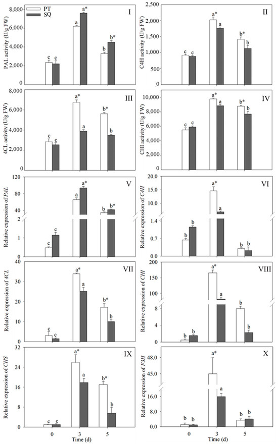 Changes in the activities of PAL (I), C4H (II), 4CL (III), and CHI (IV) and the expression levels of PAL (V), C4H (VI), 4CL (VII), CHI (VIII), CHS (IX), and F3H (X) in buckwheat sprouts. Distinct lowercase letters signify statistically significant differences in germination times for the same buckwheat cultivar (p < 0.05). Asterisks (*) denote significant differences among buckwheat cultivars at identical germination times (p < 0.05). PT: Pintian. SQ: Suqiao.