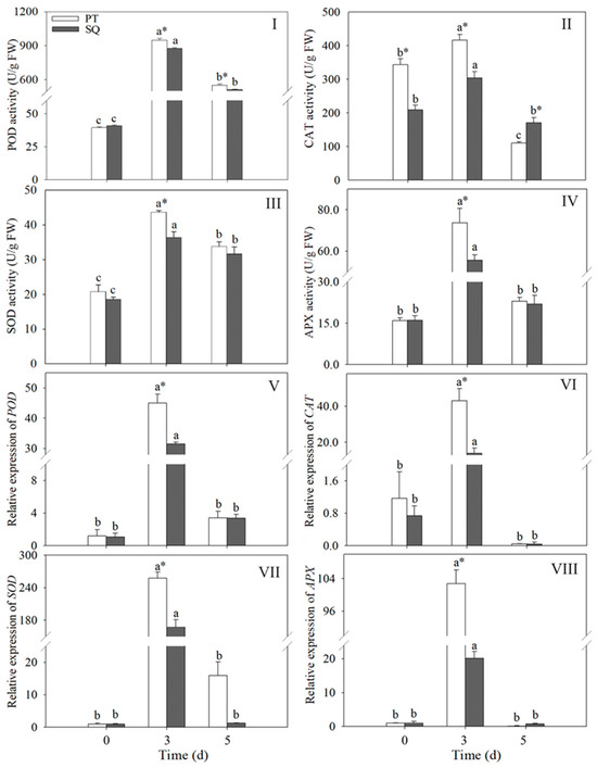 Changes in the activity of POD (I), CAT (II), SOD (III), and APX (IV) and the expression levels of POD (V), CAT (VI), SOD (VII), and APX (VIII) in buckwheat sprouts. Distinct lowercase letters signify statistically significant differences in germination times for the same buckwheat cultivar (p < 0.05). Asterisks (*) denote significant differences among buckwheat cultivars at identical germination times (p < 0.05). PT: Pintian. SQ: Suqiao.