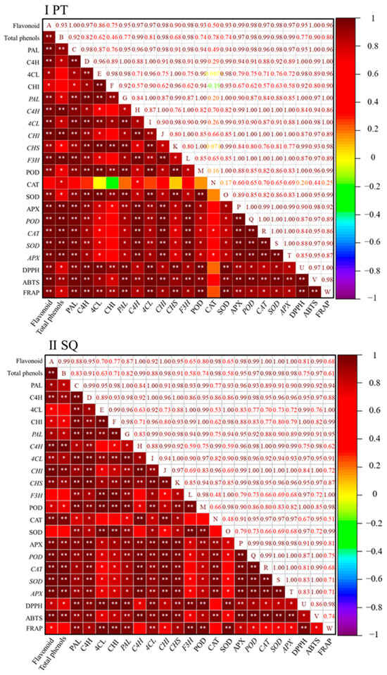 The examination of the correlation analysis of flavonoids with various indexes in Pintian sprouts and Suqiao sprouts is represented by (I) and (II), respectively. Negative correlations are indicated by shades of purple, blue, and green, whereas positive correlations are represented by shades of red. The correlation coefficients can vary from −1 to 1. Asterisks (*) and (**) denote that the correlation coefficient is statistically significant at p-value thresholds of 0.05 and 0.01, respectively. PT: Pintian; SQ: Suqiao.