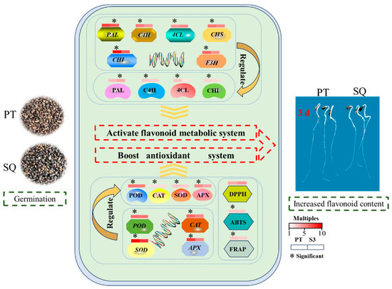 Figure 6 depicts the predicted molecular process of the flavonoid production in the two buckwheat cultivars after three days of germination. At this moment, the flavonoid concentration in both cultivars had peaked. The higher flavonoid content in these cultivars is due to flavonoid production being regulated by flavonoid-metabolizing enzyme activity and gene expression levels. However, after three days of germination, the flavonoid content differed between the two cultivars, owing mostly to changes in C4H, 4CL, and CHI activity, as well as expression levels of C4H, 4CL, CHI, CHS, and F3H. Furthermore, the antioxidant system in both germinates was active after three days, as evidenced by the antioxidant enzyme activity and gene expression. Interestingly, the antioxidant content of the Pintian sprouts topped that of the Suqiao sprouts.