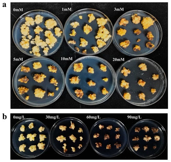 Washing: The calli were co-cultured in an incubator at 19–22 °C in the dark for 24, 48, 72, or 96 h. After co-culturing, the calli were rinsed thoroughly with sterile water, then agitated in a solution containing antibiotics. After removing the liquid, the calli were dried on sterile filter paper, turning them periodically to ensure complete drying.