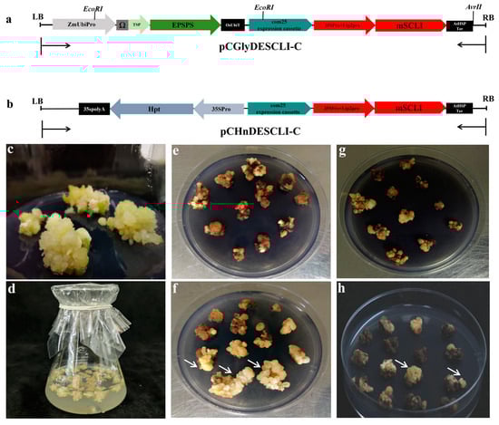Agrobacterium-mediated transformation of oil palm EC using glyphosate based on pCGlyDESCLI-C vector and hygromycin based on pCHnDESCLⅠC: (a,b) The T-DNA of pCGlyDESCLI-C vector and pCHnDESCLⅠ-C, respectively (Gly, glyphosate; Hn, hygromycin; ZmUbipro, maize ubiquitin promoter; Ω, enhancer; TSP, chloroplast target peptide from tobacco; OsUbiT, rice ubiquitin terminator; 35SPro, CaMV35S constitutive promoter; Ltp2pro, seed-specific promoter; mSCLⅠ, mScarlet-Ⅰ; AtHSP-Ter, heat shock protein terminator of Arabidopsis thaliana; Hpt, hygromycin phosphotransferase gene; 35spolyA, CaMV35S polyA terminator; com25,a fatty acid functional gene); (c) WT EC; (d) infection; (e) Wild-type EC on the selection medium containing 3 mM of glyphosate after about 15 weeks of infection; (f) Positive calli on the selection medium containing 3 mM of glyphosate after about 15 weeks of infection. (g) Wild-type EC on the selection medium containing 60 mg/L of hygromycin after about 15 weeks of infection; (h) Positive calli on the selection medium containing 60 mg/L of hygromycin after about 15 weeks of infection. The white arrow heads indicated the suspected resistant calli in (f,h).