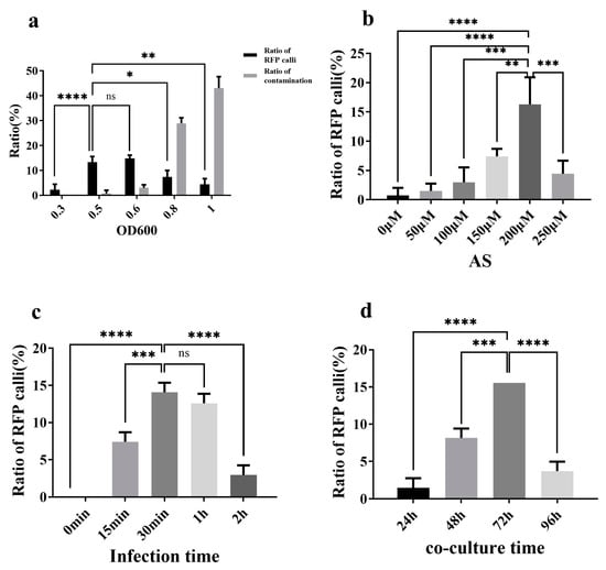 Effects of Agrobacerium tumefaciens cell density (OD600): (a), Acetosyringone (AS) concentration (b), infection time (c), and co-cultivation time (d) on oil palm transformation. “*” indicates statistically significant differences (p < 0.05); “**” indicates significant differences (p < 0.01); “***” indicates very significant differences (p < 0.001); “****” indicates extremely significant differences (p < 0.0001); ns indicates no significance.