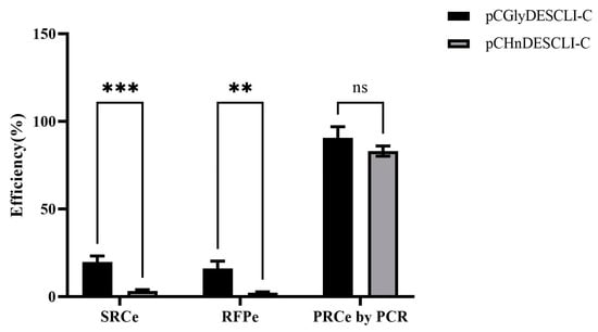 Agrobacterium-mediated transformation efficiency of two selection systems of oil palm. SRCe, suspected resistant calli efficiency; RFPe, the red fluorescence protein efficiency; and PRCe by PCR, positive calli efficiency of resistant calli by PCR. “**” indicates significant differences (p < 0.01), “***” indicates very significant differences (p < 0.001), ns indicates no significance.