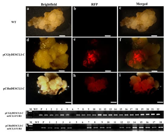 Visualization of RFP spots of glyphosate or hygromycin resistant calli and PCR detection results: (a–c), (d–f) and (g–i), visualization of brightfield, RFP and merged on wild-type ECs, glyphosate resistant ECs and hygromycin resistant ECs, respectively; (j,k), glyphosate resistance calli and hygromycin resistance calli detection by PCR (WT: wild-type EC; P, the vector pCGlyDESCLⅠ-C or pCHnDESCLⅠ-C plasmid used as the positive control, respectively; Lane 1–22, independent glyphosate-resistant calli samples; lane 1–18, independent hygromycin-resistant calli samples).