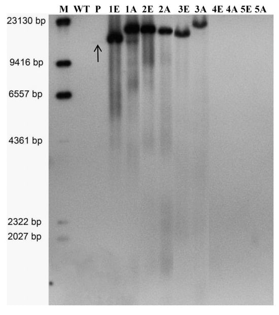 Southern blotting was used to detect the presence of transformed, PCR-positive EC []. The transformation vector pCGlyDESCLI-C served as the positive control, while total genomic DNA was extracted from freshly collected PCR-positive oil palm EC and wild-type EC. Southern blot analysis included the digestion of genomic and plasmid DNA, electrophoresis, capillary membrane transfer (Amersham Hybond-N+), hybridization and non-radioactive detection []. The target DNA fragment was detected using a probe, 556 bp fragment, which was amplified from the EgmSCLⅠ gene using primers EgmSCLI-Sb-F and EgmSCLI-Sb-R (listed in Supplementary Table S1).