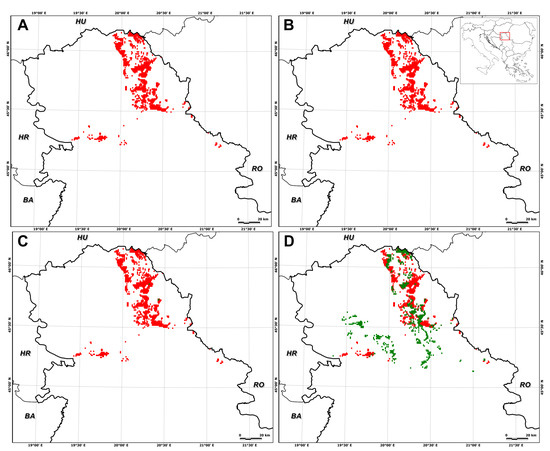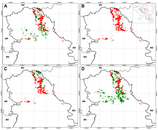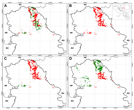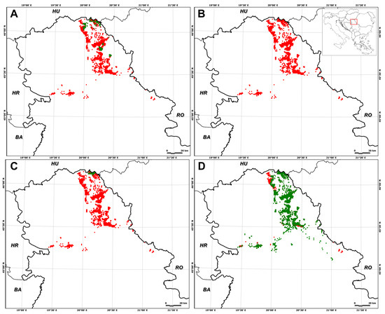 Mid-term distribution prediction (2041–2070) of Entosthodon hungaricus in Serbia, with a climate change scenario of a low-emission projection obtained for different global circulation models: (A) GFDL-ESM4; (B) UKESM1-0-LL; (C) MPI-ESM1-2HR; (D) IPSL-CM6A-LR). The green areas represent species predicted in the suitable distribution range, while red areas show a reduction in the suitable range.