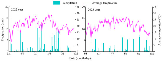 The experiments were conducted from April 2022 to September 2023 at the Irrigation Experiment Station of the Jingtai Chuan Electricity Lift Irrigation Water Resources Utilization Centre in Gansu Province, China (latitude 37°21′55′′ N, longitude 104°08′43′′ E), at an altitude of 1562 m. This region experiences a temperate arid continental climate. The multi-year averages for sunshine hours, frost-free days, solar radiation, temperature, precipitation, and evapotranspiration are 2652 h, 191 days, 6.18 × 105 J-cm−2, 8.6 °C, 201.6 mm, and 2761 mm, respectively. The soil in the test area consisted of 71.8% sand (2–0.02 mm), 17.4% silt (0.02–0.002 mm), and 10.8% clay (<0.002 mm), and was classified as sandy loam according to the United States Department of Agriculture (USDA) soil classification standards. Details on the physical and chemical properties of the soil are provided in Table 1. Precipitation during the experimental period was 147.29 mm in 2022 and 75.61 mm in 2023, while the average daily air temperatures were 19.07 °C and 20.58 °C, respectively. These climatic data are illustrated in Figure 1.