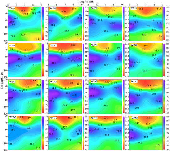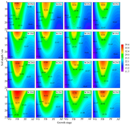 Soil temperature varied with the growth stages, initially increasing and then decreasing, peaking in July (the full fruit stage). The temperature at depths of 10 cm, 15 cm, 20 cm, and 25 cm decreased by 1.28–5.32 °C, 3.2–8.71 °C, 5.96–11.23 °C, and 7.44–15.21 °C, respectively, compared to that at 5 cm (Figure 4). At the same irrigation level, the soil temperature showed the order of N0 > N1 > N3 > N2, and the average increase in N0 was 7.60–15.37 °C, 4.45–9.52 °C and 2.04–5.97 °C compared with N1, N2 and N3, respectively. At the same nitrogen application level, the soil temperature was W3 > W2 > W1 > W0, and W3 was 7.60–15.37 °C, 4.45–9.52 °C and 2.04–5.97 °C higher on average than W0, W1 and W2, respectively.
