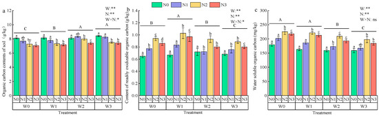 Effects of water and nitrogen regulation on soil carbon fractions. Note: Different lowercase letters indicate that there is a significant difference between different nitrogen application rates under the same irrigation amount, and different uppercase letters indicate that there is a significant difference between different irrigation amounts (p < 0.05). In the analysis of variance, * and ** indicated that the correlation reached a significant level (p < 0.05) and a very significant level (p < 0.01), respectively, and ns indicated that the correlation was not significant (p > 0.05).