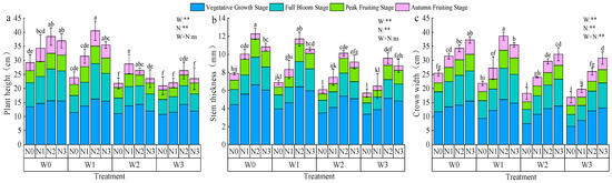 Crown growth exhibited a similar pattern, with faster increases during the nutritive growth and full flowering stages and slower growth during the full fruiting and autumn fruiting stages (Figure 6c). At the same nitrogen application level (excluding N2), crown growth increased with more irrigation. At the same irrigation level, crown growth (excluding W1) also increased with higher nitrogen application. The largest crown growth was recorded in W1N2 (38.62 cm), which was 43.48% and 56.44% higher than in W1N0 and W3N0, respectively.