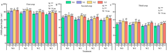 Overall, alfalfa plant height followed the trend of first crop > second crop > third crop, significantly influenced by nitrogen application (Figure 7). Irrigation enhanced alfalfa height by 1.21–5.68%, 6.31–12.78%, and 7.69–12.71% in the first, second, and third crops, respectively. Nitrogen application also increased alfalfa height by 3.66–5.88%, 9.85–14.27%, and 7.2–17.03% in the first, second, and third crops, respectively (p < 0.05). At the same irrigation rate, the height increased by an average of 6.55%, 2.12%, and 15.91% in N2 compared to N0, N1, and N3. Maximum plant height was observed under W1N2, W0N2, and W0N3 treatments, respectively.