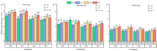 Both irrigation and nitrogen application significantly influenced alfalfa stem thickness, with the interaction being significant only for the third crop, which showed reductions of 31.60% and 54.43% in the second and third crops compared to the first crop (Figure 8). With constant irrigation, the order of stem thicknesses across the three crops was N3 > N2 > N1 > N0, with N0, N1, and N2 decreasing by an average of 4.02%, 12.68%, and 21.94%, respectively, compared to N3. For the same nitrogen application, stem thickness was ranked as W0 > W1 > W2 > W3, with W0 increasing by an average of 5.02%, 15.97%, and 19.96% compared to W1, W2, and W3. The highest average stem thickness across the three crops was in W0N3 (2.95 cm), while the lowest was in W3N0 (2.04 cm).