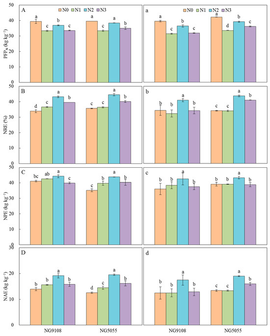 Effect of mid-stage nitrogen compensation timing on N utilization efficiency of Japonica super rice. PFPN, NRE, NPE, and NAE are the partial factor productivity of N fertilizer, N apparent recovery efficiency, N physiological use efficiency, and N agronomic use efficiency, respectively. Different letters indicate statistical significance at the 0.05 probability level. Error bars indicate the standard error. (A–D) represent the year 2017, and (a–d) represent the year 2018.