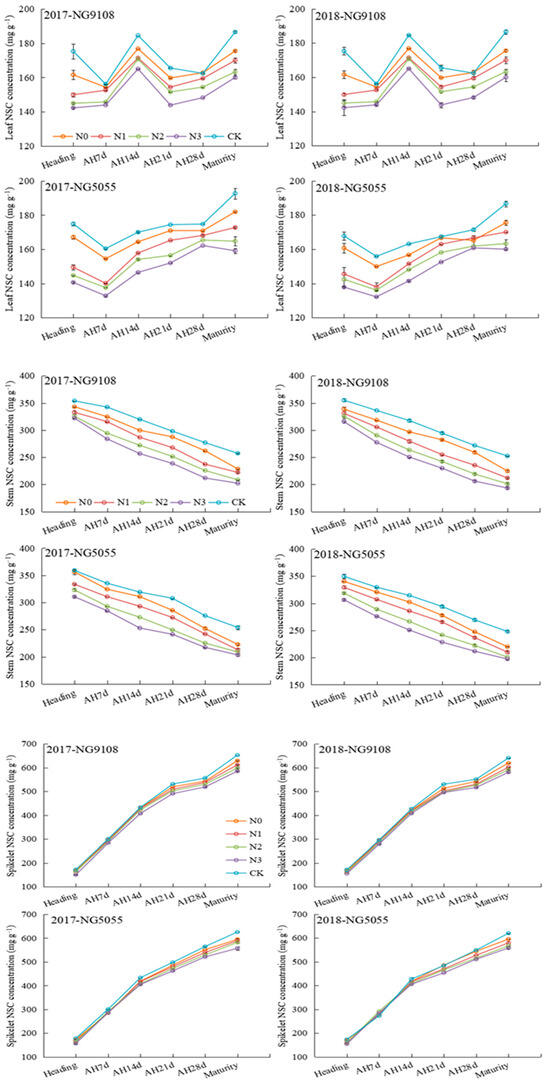 The leaf NSC concentration remains relatively stable throughout the grain filling period, showing minimal variation between the heading stage and maturity, as depicted in Figure 2. However, it is significantly influenced by mid-stage N compensation treatment, which exhibited that there is a decline in leaf NSC concentration during grain filling as the timing of mid-stage nitrogen compensation is delayed. The stem NSC concentration gradually decreased over the same time, reaching the nadir at maturity, a trend which closely resembles that observed for leaf NSC concentration. Moreover, the spike NSC showed a consistent upward trajectory for both varieties during grain filling. The increasing trend was obvious in the first 14 days after heading, and the difference was small among different mid-stage N compensation treatments. From 14 days later, after heading, the difference of the spike NSC concentration among different treatments began to increase, and it gradually decreased with the delay of N compensation. The stem NSC concentration of the CK treatment was the highest at maturity, followed by N0 treatment, and N3 treatment was the lowest, in which NG9108 and NG5055 decreased by 9.4% and 10.1% compared with N0 treatment, respectively.