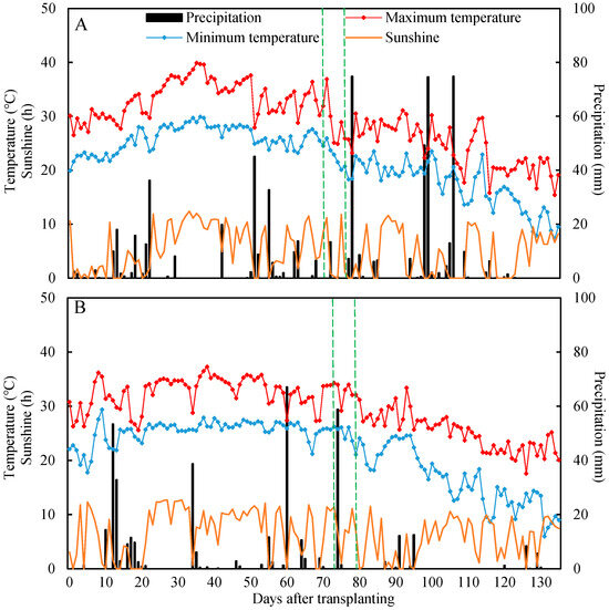 Daily temperature, sunshine duration, and precipitation during rice growing season in 2017 (A) and 2018 (B) at a field site in Yazhou Town, Jiangsu Province, China. Dotted lines in green indicate the heading times for Nangeng 9108 and Nangeng 5055.