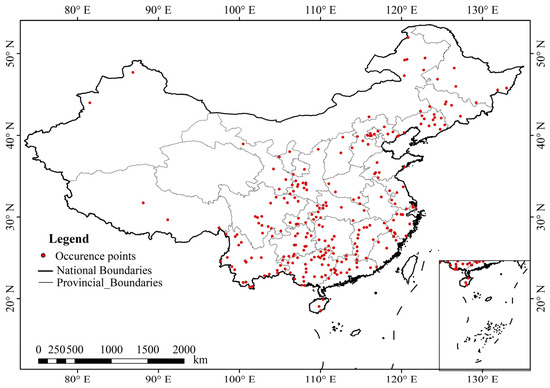 The study area was located in China (3.85–53.55° N, 73.55–135.08° E), where A. calamus commonly grows in wetland environments such as riverbanks, marshes, or lakeshores, typically at altitudes below 2600 m [31]. It thrives in warm, humid climates with abundant sunlight, with an optimal growth temperature range of 20–25 °C. Growth halts when temperatures fall below 10 °C [31]. During winter, its rhizomes retreat into the soil to overwinter. It prefers loose, well-aerated soils with good water retention and nutrient-holding capacity and can tolerate periods of waterlogging [31]. In shallow water environments, A. calamus grows well, with lush foliage and thick rhizomes; however, under flooded conditions, its growth slows or even halts [35]. In this study, the distribution data of A. calamus were sourced mainly from the Global Biodiversity Information Facility (GBIF, http://www.gbif.org/), the Chinese Virtual Herbarium (CVH, http://www.cvh.ac.cn/), relevant literature, and field surveys conducted from May 2022 to May 2023. A total of 339 distribution points of A. calamus were collected. Duplicate coordinates and points with unclear geographic coordinates were removed. Additionally, for points with distances less than 5 km between them, only one point was retained to reduce the potential clustering effects that could lead to model overfitting [36]. This process resulted in a final dataset of 266 distribution points of A. calamus for modeling (Figure 1).