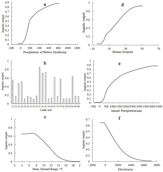 Response curves of the six major environmental factors. (a) Precipitation of the wettest month; (b) Land use; (c) Mean diurnal range; (d) Human footprint; (e) Annual precipitation; (f) Elevation.