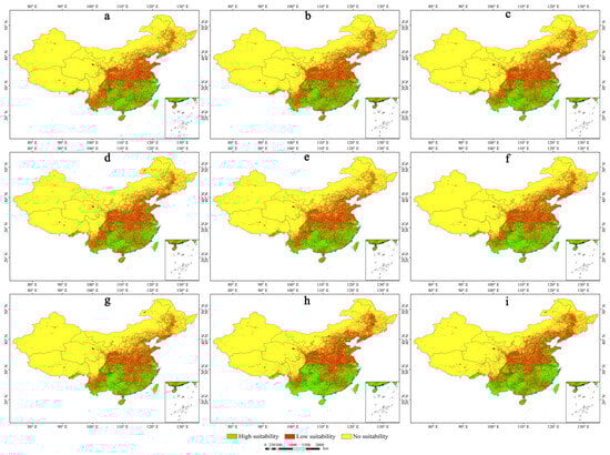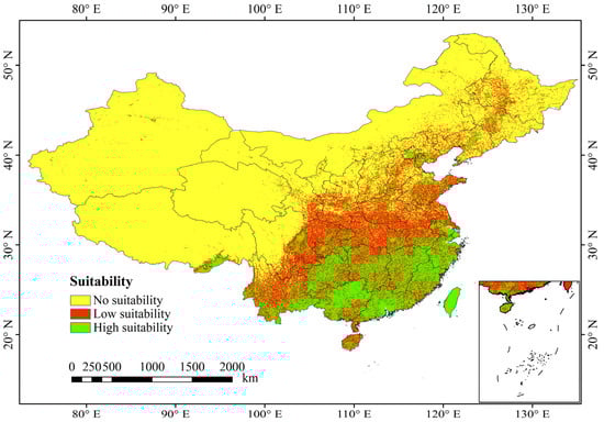 The suitability of a species’ geographical distribution is commonly expressed on a scale from 0 to 1, where higher values denote greater suitability for the species’ survival in the specified area [45]. In our study, the ASCII files produced by MaxEnt were imported into ArcGIS and transformed into raster files (TIFF format). With the “Reclassify” function, the potentially suitable geographical distribution areas for the species were classified into three levels: unsuitable (p < 0.2), low suitability (0.2 ≤ p < 0.4), and high suitability (p ≥ 0.4)