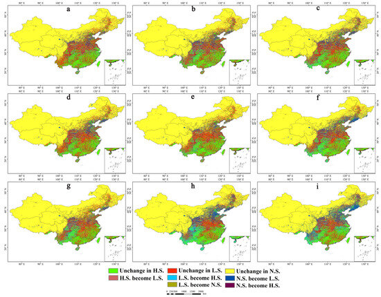 Future dynamic changes of different grade distribution areas. (a) 2050s-SSP126; (b) 2050s-SSP370; (c) 2050s-SSP585; (d) 2070s-SSP126; (e) 2070s-SSP370; (f) 2070s-SSP585; (g) 2090s-SSP126; (h) 2090s-SSP370; (i) 2090s-SSP585.