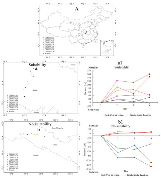 Future centroid movement of the potential geographical distribution area of A. calamus under different climate change scenarios. (A) Centroids in China; (a) Centroids in suitable area. (b) Centroids in unsuitable area; (a1,b1) indicates the distances that centroids of different grades of suitable distribution area migrate in two directions (north–south and east–west) under future climate change.