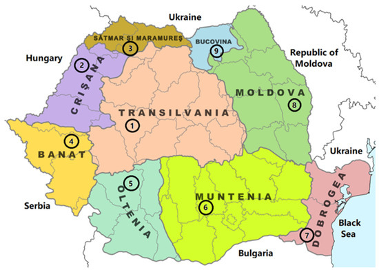 The propolis sampling sites in Romania. 1–9: sampling areas.