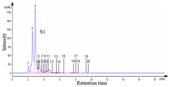In Figure 3, a comparative evaluation, delayed by 10 min, of the chromatograms for the aqueous propolis extracts S2–S3 from Romania is presented.
