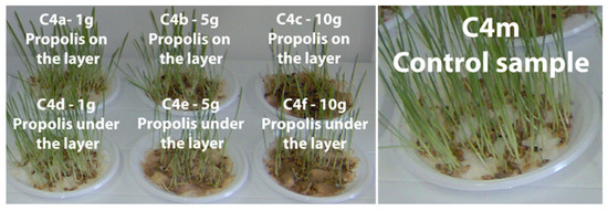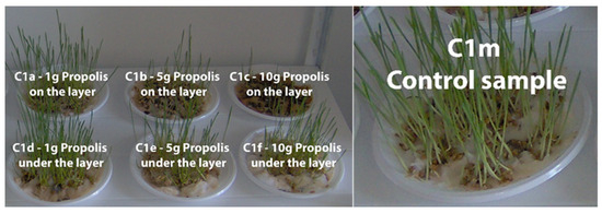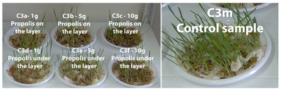In Petri dishes (with a surface area of 20 cm2) on which the same amount of hydrophilic wool was introduced, cereal grains were added and watered periodically. Later, 1, 5, and 10 g of propolis (powder) were introduced. The two cases followed were: (1) homogenization of propolis with the wool layer (in layer); and (2) propolis was added to the surface of hydrophilic wool (on layer). Readings were taken every other day for 13 days, and statistical evaluations (averages) were performed on 10 sprouted seedlings [56,57].