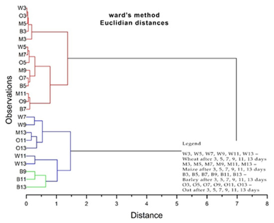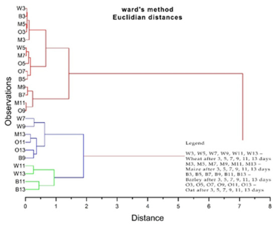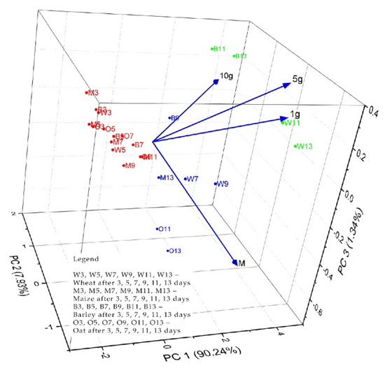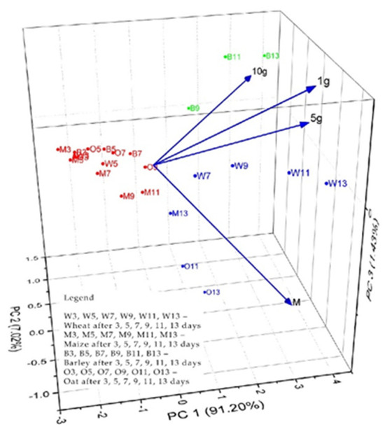 For the germination periods of the cereal samples treated with different doses of propolis on the layer and under the grain crops layer, principal component analysis (PCR) was used with the software Origin Pro 2020 (Stat-Ease Inc., Minneapolis, MN, USA), respectively the Pearson correlation coefficient to correlate the content of phenols and flavonoids with the MIC of microorganisms. The Pearson’s correlation test was performed using Minitab software (Minitab, LLC, State College, PA, USA).