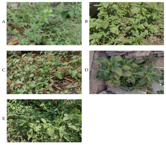 Photographs of the studied species of the genus Amaranthus L.: (A) A. albus L.—Stara Zagora; (B) A. blitum L.—Kyustendil; (C) A. deflexus L.—Gabarevo; (D) A. hybridus L.—Velingrad; (E) A. retroflexus L.—Voneshta voda.