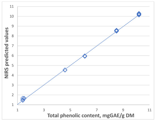 Table 4 shows the statistics for the NIRS equations for the prediction of polyphenolic compounds and the antioxidant potential of the tested species. The results of the NIRS analysis were comparable with the reference chemical methods. The determination accuracy was very high. For each of the tested parameters, the correlation coefficient Rcv was 0.99, and the determination errors were small. A graphical illustration of the accuracy of the NIR spectroscopy prediction of the total phenolic content is presented in Figure 4.