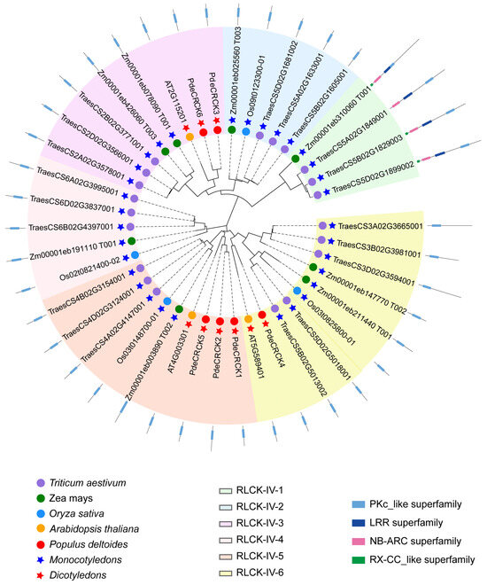 Phylogenetic analysis of green-plant RLCK-IV/CRCK subfamily members. A total of 41 RLCK-IVs were identified in A. thaliana, rice, wheat, maize, and P. deltoides. The phylogenetic relationship between P. deltoides and the aforementioned species was analyzed using the maximum likelihood method (ML) with JTT+G and a bootstrap analysis with 1000 replicates in MEGA 11.0.13. The 41 RLCK-IVs were divided into six groups and designated as RLCK-IV-1 to RLCK-IV-6. The different colors in the circle indicate the different species. The red star represents the dicot plants, while the blue star represents the monocot plants. The rectangles of different colors outside the circle represent different structural domains.