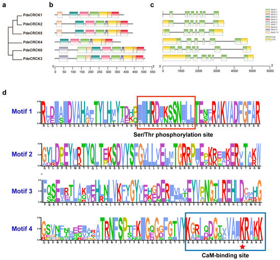 Structural organization of PdeCRCKs. (a) A phylogenetic tree that was generated using MEGA 11.0.13. (b) The conserved motifs of PdeCRCKs, with different motifs represented by different colors. (c) The exon/intron structure of the putative PdeCRCKs, with the yellow boxes indicating exons and green boxes indicating the 3′ or 5′ UTRs (untranslated regions). (d) Visualization of conserved motifs by WebLogo, with the red box representing the Ser/Thr phosphorylation site; the blue box representing the CaM-binding site; and the important residue, Lysine (K), of the CaM-binding site is highlighted by a red star.