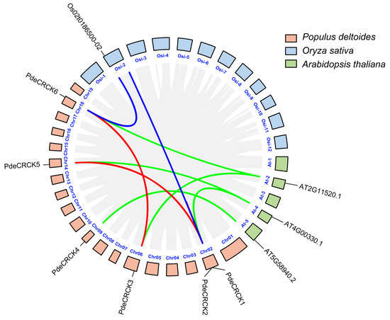 To investigate the collinearity relationships among P. deltoides, O. sativa, and A. thaliana, the One Step MCScanX-Super Fast program in TBtools 2.0 was utilized for a preliminary analysis of intra-species and inter-species collinearity in P. deltoides. The Advanced Circos program in TBtools 2.0 was used to visualize the collinearity among RLCK-IVs/CRCKs [46].