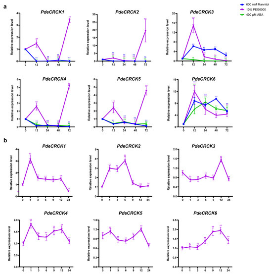 Following PEG treatment, the transcripts of PdeCRCK1, PdeCRCK2, PdeCRCK4, and PdeCRCK5 initially increased at 12 h, followed by a decline at 24 h and 48 h, and rose sharply again at 72 h (Figure 6a). In contrast, their expression levels consistently decreased under mannitol and ABA treatments. Notably, the transcripts of PdeCRCK3 initially increased approximately 14.9-fold at 12 h under PEG treatment, subsequently declining to 0.02 times the initial level by 72 h (Figure 6a). Meanwhile, under mannitol treatment, PdeCRCK3 transcripts initially increased by 6.22-fold, exhibiting fluctuations thereafter, and reached 2.39 times the initial level by 72 h (Figure 6a). In contrast, under ABA treatment, PdeCRCK3 transcripts continuously decreased, reaching 0.01 times the initial level by 72 h. Conversely, PdeCRCK6 transcripts were induced under all treatments (PEG, mannitol, and ABA), showing consistent down-regulation after 24 h under PEG, an initial increase from 12 h to 24 h under mannitol, followed by a decline at 48 h and 72 h, and peaking at 12 h and 48 h under ABA. In all cases, expression at each time point was over 4-fold higher compared to 0 h (Figure 6a). All PdeCRCKs showed an induced expression following PEG treatment. The induction levels within 24 h for a short-term treatment under PEG was assessed, revealing distinct peak expressions of PdeCRCKs. Specifically, following PEG treatment, PdeCRCK1 peaked at 1 h, PdeCRCK3 at 12 h, and PdeCRCK6 at 9 h and 12 h (Figure 6b). Additionally, three genes exhibited two peaks: PdeCRCK2 peaked at 3 h to 6 h, PdeCRCK4 at 1 h and 12 h, and PdeCRCK5 at 1 h and 12 h (Figure 6b). These results suggest that the six PdeCRCKs may respond to osmotic stress in different ways.