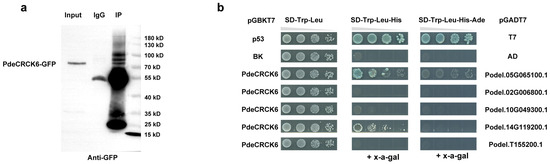 Proteins that interact with PdeCRCK6. (a) Co-immunoprecipitation of PdeCRCK6-GFP. The antibody is the ProteinFind Anti-GFP Mouse Monoclonal Antibody from TransGen Biotech. (b) PdeCRCK6 interacted with both AAA-type ATPase family proteins (Podel.05G065100.1) and ubiquitin 6 (Podel.14G119200.1), as determined by a yeast two-hybrid analysis.