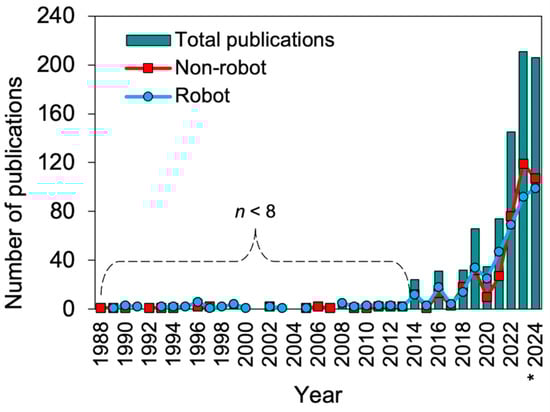 - What is the current state of research on agricultural robots tailored to specialty crops in the literature?Research on agricultural robots for specialty crops has grown substantially in the past decade, with scholarly contributions increasing sixfold.