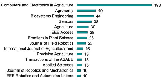 - Which journals are most active in publishing research on agricultural robots for specialty crops?