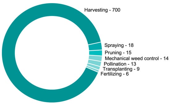 - Power systems: For the most part, the electric system is predominant. This is undoubtedly an advance on common fuel systems. Consequently, their productivity can be enhanced with efforts made with charging stations. Furthermore, greater investment can be also made in solar power systems, for example [80,84]. This type of power supply both contributes to sustainability and increases the operability of robots.