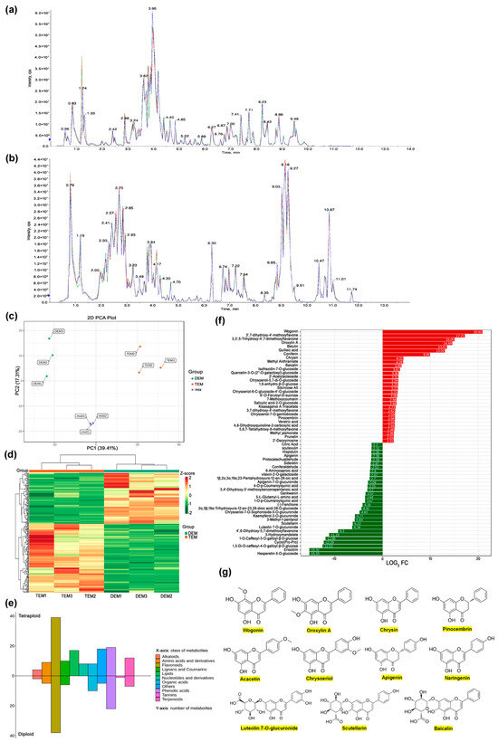 Following an in-depth analysis, it was observed that, in comparison to the diploids, a number of substances, including wogonin, 3′,7-dihydroxy-4′-methoxyflavone, 3,3′,5-trihydroxy-4′,7-dimethoxyflavanone, oroxylin A, betulin, chrysin, quillaic acid, coniferin, methyl anthranilate and baicalin, demonstrated a greater accumulation in tetraploids (Figure 4f and Table S1). It is worthy of note that the top seven substances were not detected in diploids. Similarly, it was observed that certain substances, including hesperetin-5-O-glucoside, eriocitrin, cyclo (Pro-Pro), and 3-hydroxymandelate, were undetected in tetraploid samples but exhibited elevated accumulation in diploids (Figure 4f and Table S1). This outcome may indicate that alterations in ploidy have initiated modifications in specific metabolic pathways. In particular, the accumulation of methoxyflavonoids in tetraploids was observed to be the most significant among all substances. The aforementioned substances exhibited a comparable carbon skeleton structure (Figure 4g), which may indicate a similar structure–activity relationship. Additionally, the accumulation of terpenoids (betulin, quillaic acid, asiatic acid), LysoPE (18:1, 17:1, 16:0, etc.), and free fatty acids ((7Z)-hexadecenoic acid, vaccenic acid, petroselinic acid, linoleic acid) was also observed in tetraploids to varying degrees above diploids (Table S1).