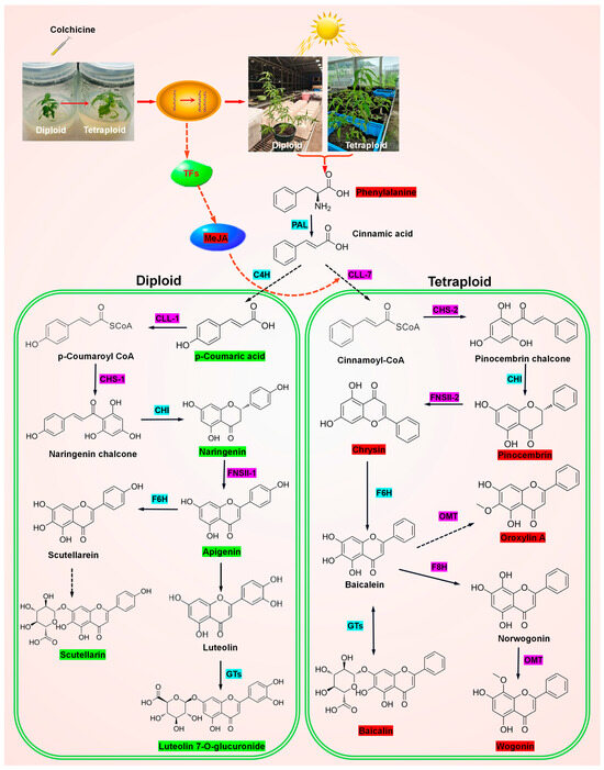 A substantial body of research has demonstrated that light exerts a regulatory effect on key enzymes involved in polyphenol metabolism. The activity of enzymes involved in polyphenol metabolism was influenced by the quality and intensity of light, which in turn affected polyphenol synthesis [44]. Furthermore, our previous research proved that polyploidy had a significant effect on the photosynthetic capacity of E. splendens. It would be meaningful to ascertain whether there is an inherent correlation between these two phenomena. However, previous reports have indicated that baicalin and baicalein are not exclusively produced in the roots of S. baicalensis but are also found in leaves [45]. It was, therefore, evident that the alteration in synthase nature in the polyphenol roots of S. baicalensis was not merely a consequence of the presence or absence of light. In 2019, Zhao et al. demonstrated that the 4′-deoxyflavonoid pathway evolved through genomic changes including gene mutations (SbCLL-7), gene duplications and neofunctionalisation (SbCHS-2, SbFNSII-2, SbF8H and SbPFOMT), gene amplification (SbCHS-2), segmental duplications (SbFNSII-1), tandem duplications and neofunctionalisation (CHS-2, FNSII-2) and tandem duplication and subfunctionalisation (SbPFOMT5) in genus Scutellaria [32]. Thus, the analogous phenomenon observed in diploid and tetraploid E. splendens was not merely attributable to alterations in photosynthetic capacity resulting from ploidy, which then influenced the synthesis of polyphenol species. It was possible that the doubling of the genome may have resulted in tandem duplication or neofunctionalization in certain genes that regulate polyphenol synthesis in tetraploid E. splendens. This may be the most plausible explanation for the alteration of polyphenol types in tetraploid species. Additionally, methyl jasmonate was observed to be markedly accumulated in the tetraploid relative to the diploid. Schneider et al. [46] reported that SbCLL-7, which specifically ligates CoA to cinnamate, evolved from a CoA ligase involved in fatty acid/jasmonate biosynthesis. It could thus be surmised that the alteration in the ploidy level of E. splendens might result in modifications to the activity of transcription factors that influence the jasmonic acid synthesis pathway, which subsequently affected the polyphenol synthesis pathway. This is a complex question, and much more experimentation was required to elucidate the underlying mechanisms. A schematic diagram of the mechanisms involved was presented in order to illustrate the reasons for the ploidy-influenced polyphenol species observed in E. splendens (Figure 5).