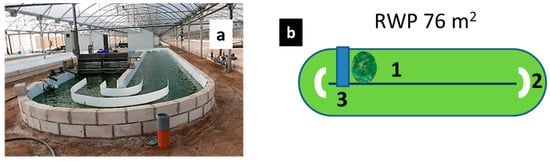 Picture and schematic diagram of the 76 m2 RWP used in this study. (a) The RWP was placed in a greenhouse which was located at the facilities of the company Biorizon Biotech in Almera, Spain (GPS coordinates: 36°49′59.7″ N, 2°24′22.7″ W). (b) Schematic diagram of the RWP with numbered positions where culture variables were monitored. Three measuring positions were defined (1—after the paddlewheel and sump; 2—at the first bend; 3—close to the end of the second channel before the deflectors and paddlewheel).