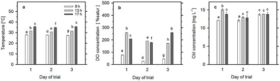 (a) Daily changes in temperature (°C), (b) dissolved oxygen concentration (saturation in %) and (c) Chl concentration measured in the cultures during the three-day trial. Data were monitored at 9:00, 13:00 and 17:00 h. Values are presented as a mean of figures measured at 3 positions in the RWP (see Figure 1) ± SD; those designated by the same letter a–h did not differ significantly from each other.