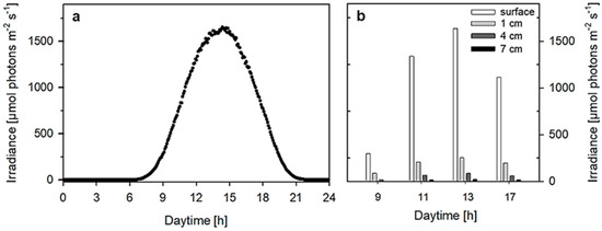 (a) An exemplary daily course of irradiance intensity monitored in the greenhouse during trials; (b) approximate irradiance levels measured in situ at the surface and 1, 4 and 7 cm deep in the culture at 9:00, 11:00, 13:00 and 17:00 h.