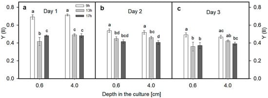 Changes in the actual photochemical yield of PSII Y(II) were measured at 9:00, 13:00 and 17:00 h on day 1 (a), day 2 (b) and day 3 (c) of the trial. Data were measured in situ at 0.6 and 4 cm depth in the culture using a Mini-PAM portable fluorimeter (for details, see Materials and Methods). Values are a mean ± SD of 3 measuring points in the RWP (see Figure 1b); those designated by the same letter(s) did not differ significantly from each other.