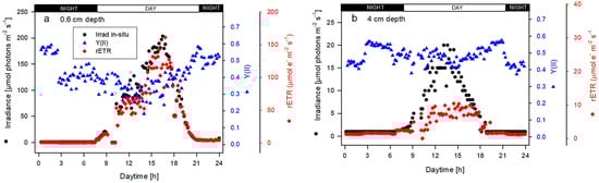 Diurnal changes in irradiance intensity (µmol photons m−2 s−1), the actual photochemical yield of PSII Y(II) and the relative electron transport rate (rETR) (µmol e− m−2 s−1) measured in situ/online in the outdoor culture during the trial. Values were measured on day 3 by two Junior-PAM portable fluorimeters (for details, see Materials and Methods) at 10 min intervals with a fiberoptics and a light mini-sensor placed together at position 1 in the RWP (Figure 1) and submerged at depths of 0.6 cm (a) and 4 cm (b). The black and white bars at the upper edge of the panels indicate the day and night periods of a diurnal cycle.