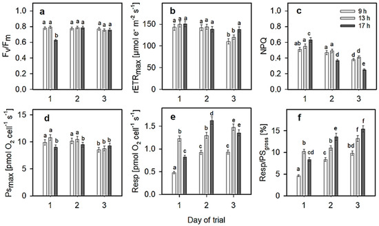 The values of Fv/Fm ranged between 0.63 and 0.79 and were relatively aligned (Figure 6a). rETRmax values were found to be between 110 and 150 µmol e− m−2 s−1 (Figure 6b), while the NPQmax was between 0.25 and 0.63, and the values decreased from day 1 to day 3; the lowest values were obtained on day 3 (Figure 6c). The ranges of Pmax and Resp were found to be between 9 and 10.8 pmol O2 cell−1 s−1 and 0.48–1.6 pmol O2 cell−1 s−1, respectively (Figure 6d,e). The data on the ratio of Resp/PSgross revealed that the minimum values, between 4.6 and 9.8%, were achieved in the morning, while the highest value—between 17.8 and 28.9 pmol O2 m−2 s−1—was found in the afternoon (Figure 6f). These data confirmed an increasing trend from the morning to the afternoon and also from day 1 to day 3. The highest values, between 11 and 15.4, were found on days 2 and 3 at 13:00 and 17:00 h. Considering the values of Pmax and Resp, it was obvious that the ratio of Resp/PSgross showed an increasing trend.